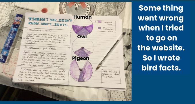 On Fridays, and the weekends, children are encouraged to do learning which does not involve looking at a screen. The children have had great fun doing these activities and I have been amazed at how creative they are. On Fridays, we are doing activities which take us outside such as ‘The Big, British Bird Watch’. We have observed what which birds we can see outside and researched them. We presented our results as a double page spread.