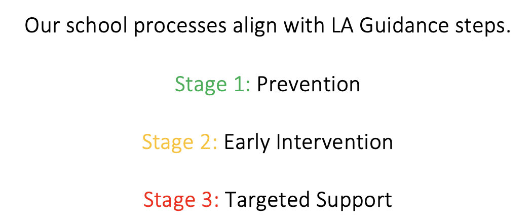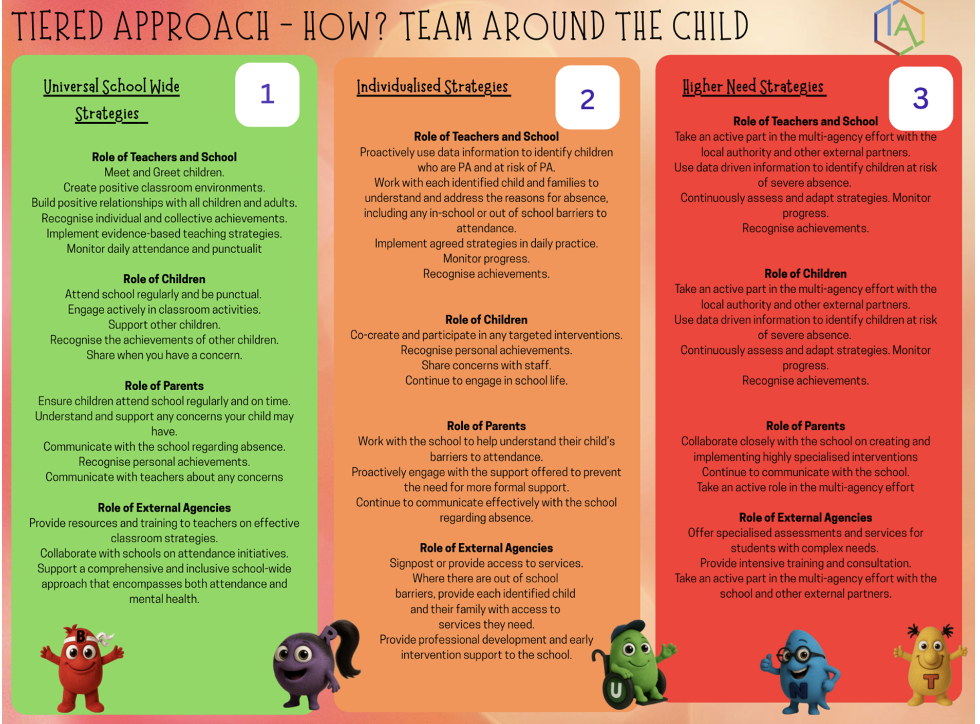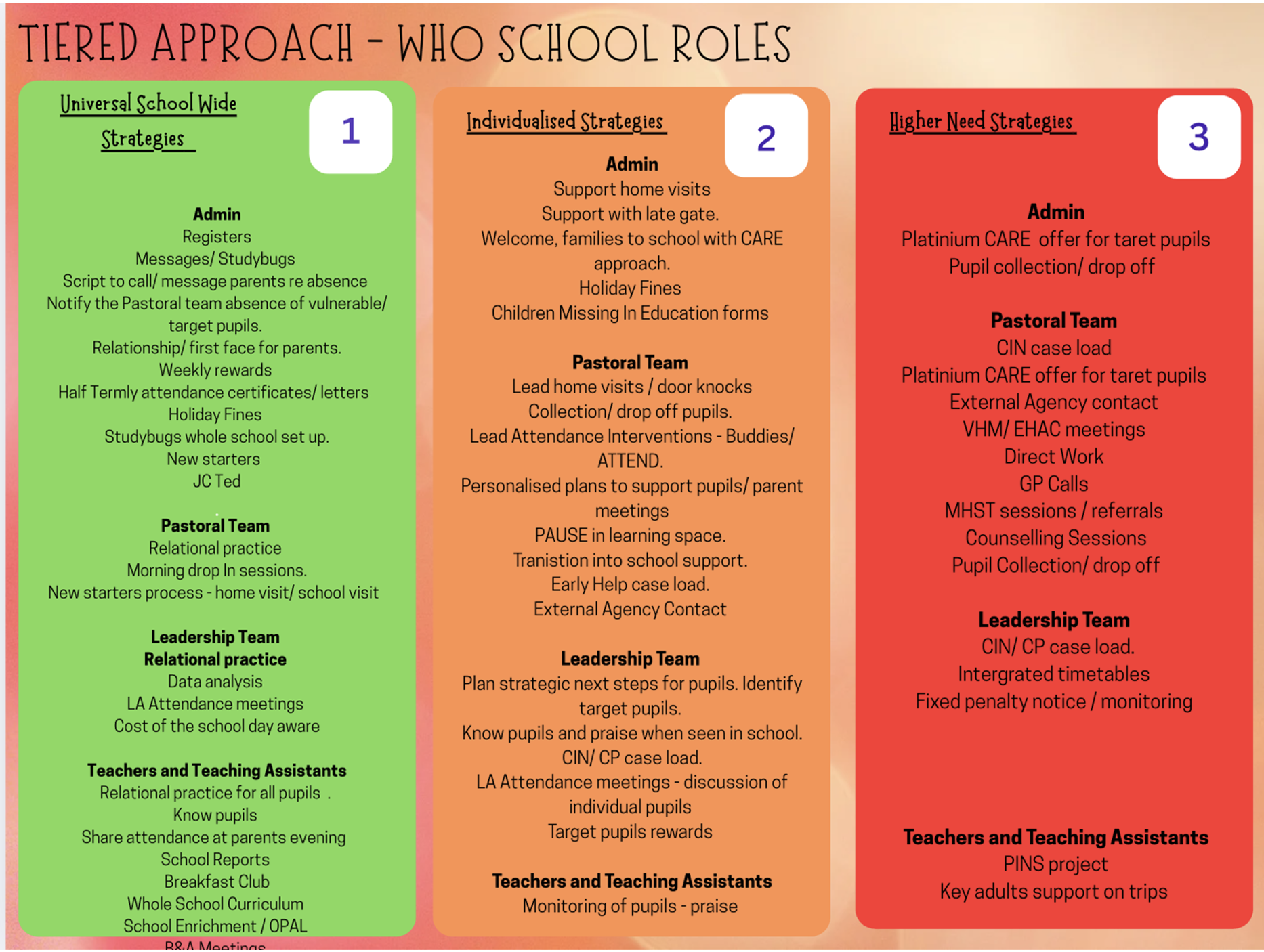 To guarantee a comprehensive approach to attendance, we implement a Multi-Tiered System of Support. A Multi-Tiered System of Support (MTSS) for school attendance involves three tiers of intervention, with roles for teachers, the school, children, parents, and external agencies – including the Local Authority. Data-driven decision-making and training requirements are pivotal to the implementation of the system. The system aligns with the Department for Education's (DFE) "Working Together to Improve School Attendance" guidelines.