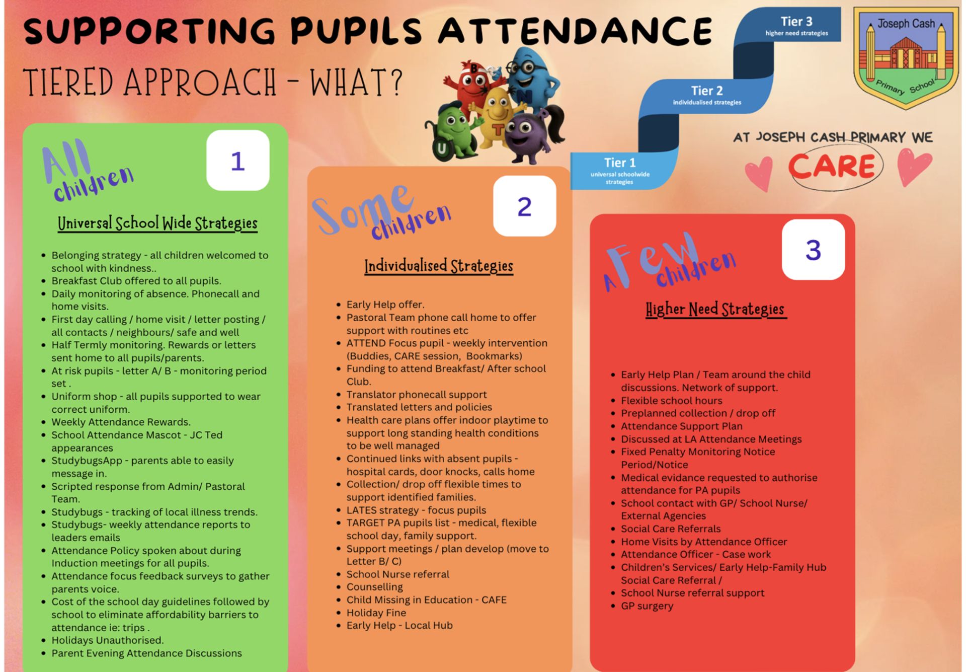 JC Ted will visit classes regularly to present attendance awards. Target pupils have bookmarks for weekly prizes. Half Termly certificates are awarded. Pupils work as Attendance Buddies and support praising attendance across the school.